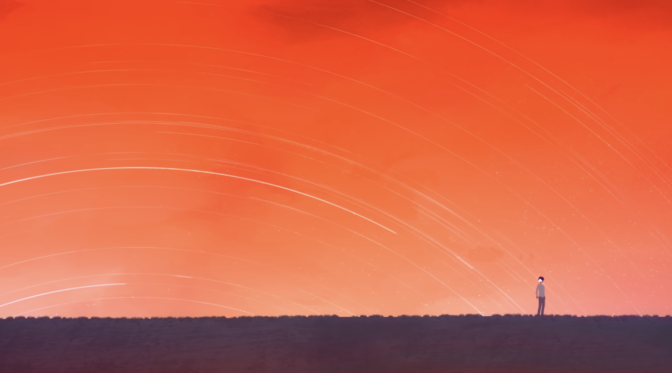 MV에서 주인공은 쪽빛 제곱, 퍼레이드에 등장했던 것과 같이 얼굴을 가린 채로 등장하며, 지금까지 등장하지 않았던 새로운 인물이 옆에 서있습니다. 맥락상 왼쪽의 여성이 엘마라고 추측해볼 수 있겠습니다. 엘마는 얼굴을 가리지 않은 채로 주인공의 뒤를 천천히 따라 걸어갑니다. 배경을 보니 기차 승강장처럼 보이네요. 요루시카 정규 앨범 2집인 「エルマ(엘마)」에 「차창」이라는 인스트루먼트 곡이 있는데 여기에 뭔가 연관이 있을지도 모르겠다는 생각이 듭니다. 엘마와 지냈던 날들도 여름날이라고 묘사되었던 것과 이미 엘마와 헤어진 현재를 생각해 봤을 때 이 부분은 회상이거나 주인공의 상상 속 엘마가 투영된 모습이라고 볼 수 있을 것 같습니다.