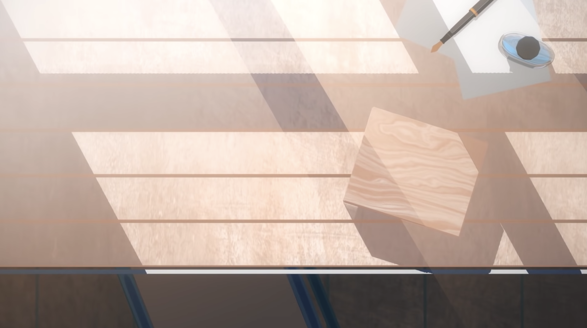 이 부분 다음에서 주인공을 따라 걷던 엘마가 사라지고, 『몇 번이고 너를 써내렸어』라는 가사에서 우측의 나무 상자와 잉크병, 펜이 비춰집니다. 이 물건들이 등장했던 쪽빛 제곱에서도 「네가 주역인 플롯을 줄곧 써내렸다」는 가사와 「어른이 되어 갈수록 머릿속에 그렸던 꿈이 시효가 되어 간다」는 내용이 나왔습니다.