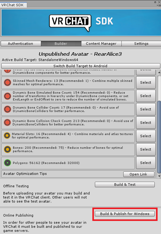 빌드하는데에 몇분정도 시간이 걸리고, 이후 이런 창이 나타나는데 여기에 아바타 이름과 Public/Private 설정 등을 마치고 Upload 버튼을 누르면 업로드가 시작됩니다. 업로드가 끝난 뒤에는 VRChat에서 아바타를 사용할 수 있습니다. :)