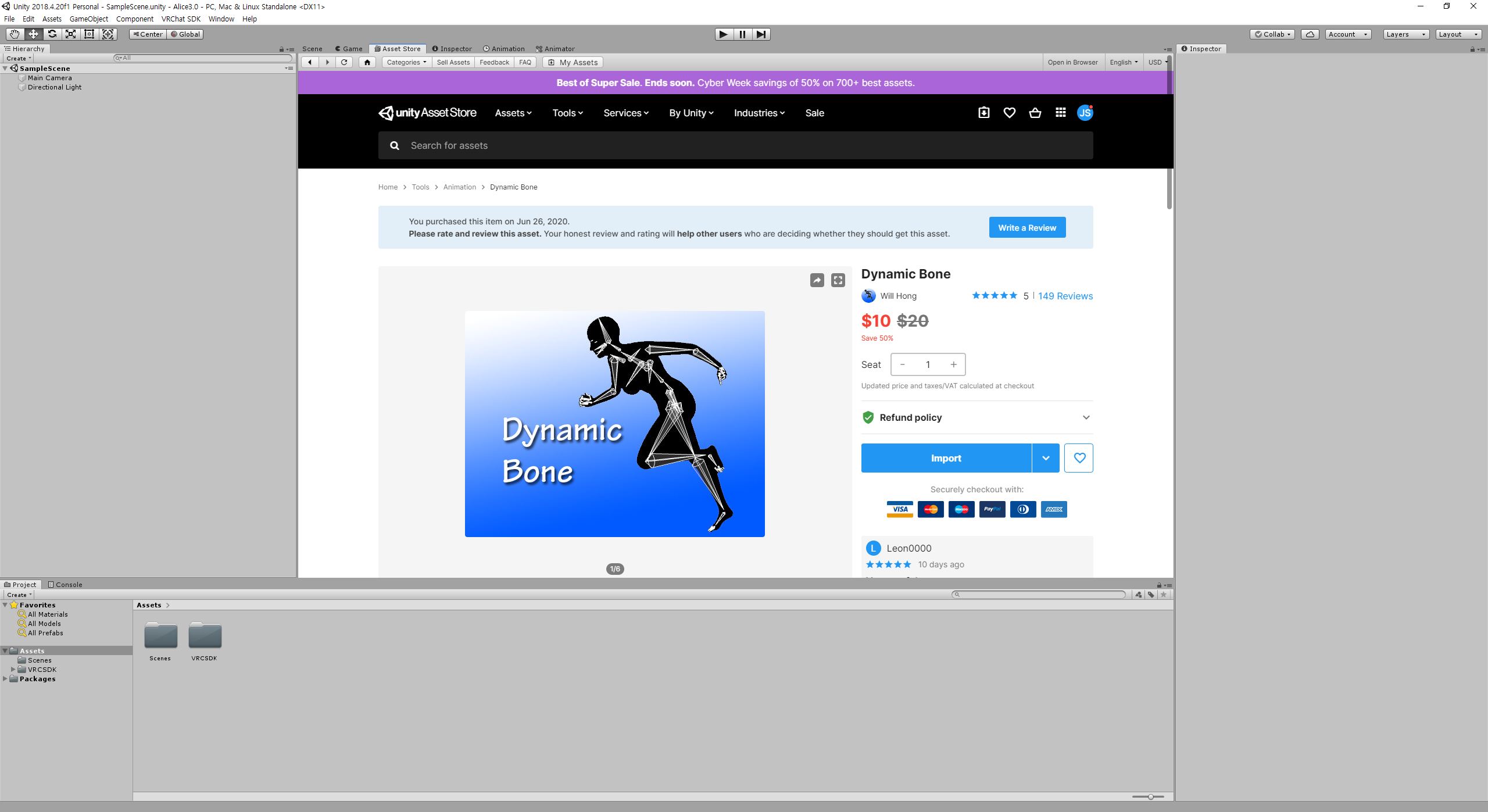 기존 VRCSDK2 아바타 업로드 글에서도 한번 언급했었는데 요새 판매되는 아바타들은 옷이나 머리에 다이나믹 본을 이용하여 부드러운 움직임을 구현해둔 경우가 많습니다. 구매하지 않았다면 별로 상관없지만 구매했다면 여기에서 먼저 다이나믹 본을 Import 해줍니다. 스크린샷에 있는 Asset Store 탭에서 유니티 계정으로 로그인하고 구매 및 Import할수 있습니다.