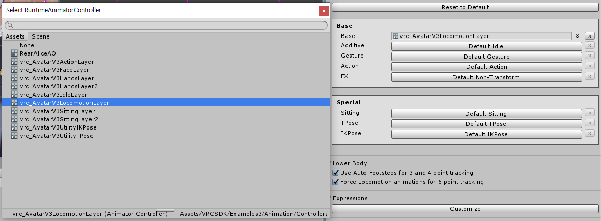 이후 Default ~ 로 설정되어 있는 버튼들을 누르고 우측의 작은 동그라미를 눌러 Animation Controller를 설정해줍니다. 이름을 보면 Locomotion 등 공통된 단어가 들어가 있는데, 이것들로 세팅해주면 됩니다. 만약 해당하는 Controller가 없을 경우 우측의 X 버튼을 눌러 Default 값으로 설정해주면 됩니다. 여기서 중요한 부분은 저 FX라는 부분인데, 이게 손가락과 표정의 움직임을 지정해준다고 생각하면 편합니다. 이 값은 예외로 HandsLayer로 설정합니다.