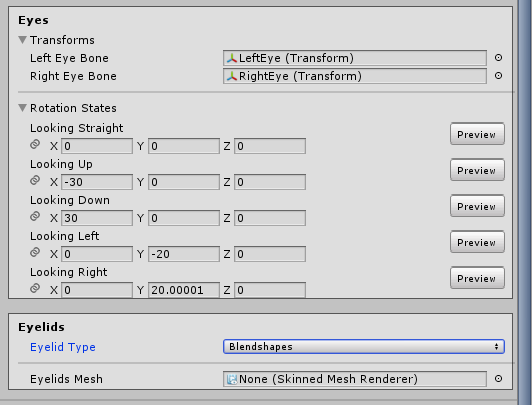 LipSync 아래의 Eye Look 메뉴를 열고 Enable 버튼을 누른 후 Left Eye Bone과 Right Eye Bone을 찾아서 세팅해줍니다. 각각 칸의 오른쪽에 있는 작은 동그라미를 누르면 세팅할 수 있습니다. 보통 이것들은 아바타를 판매하시는 분들이 모두 네이밍을 해두었기 때문에 금방 찾아서 설정이 가능합니다. 이후 Rotation States에서 위와 같이 세팅해줍니다. Preview를 통하여 실제로 눈이 어떻게 움직이는지 Scene에서 확인이 가능하기 때문에 보면서 자신의 아바타에 맞게 적당히 세팅해주면 됩니다.