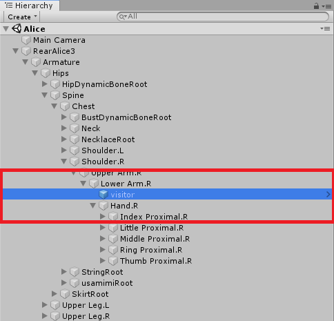 다음으로 밑에 있을 악세사리나 물체 오브젝트를 함께 움직이기를 원하는 아바타의 Armature에 드래그하여 넣어줍니다. 해당 부위의 하위에 넣어야 정상 동작합니다. 이렇게만 하면 일단 기본적으로 악세사리는 아바타에 보여지며 이대로 업로드해도 VRChat에서 악세사리 사용은 가능합니다. 하지만 우리는 버튼으로 악세사리를 On/Off하고 싶기 때문에 추가로 설정이 더 필요합니다.
