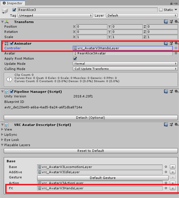 우선 아바타를 클릭하고 우측 상단의 Controller를 지정해줍니다. 아래 빨간 네모 안의 FX와 동일한 것으로 선택해주면 됩니다.