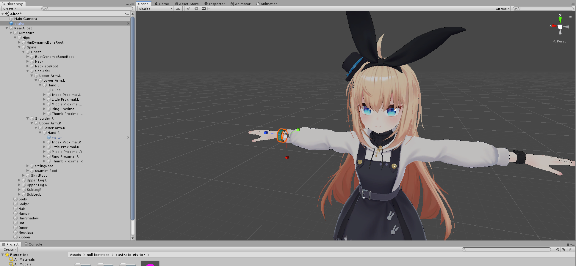 우선 간단한 악세사리를 준비해봅시다. 안경도 좋고, 칼도 좋고, 뭐든 상관없으니 아무거나 가져와서 Unity에서 import하면 됩니다. 전 요새 VRChat에서 자주 다니고 있는 Bar Castrato 방문객용 팔찌를 적용해보도록 하겠습니다. 악세사리를 import 한 후에는 위처럼 Scene에 드래그하여 원하는 위치로 해당 악세사리를 옮겨줍니다.