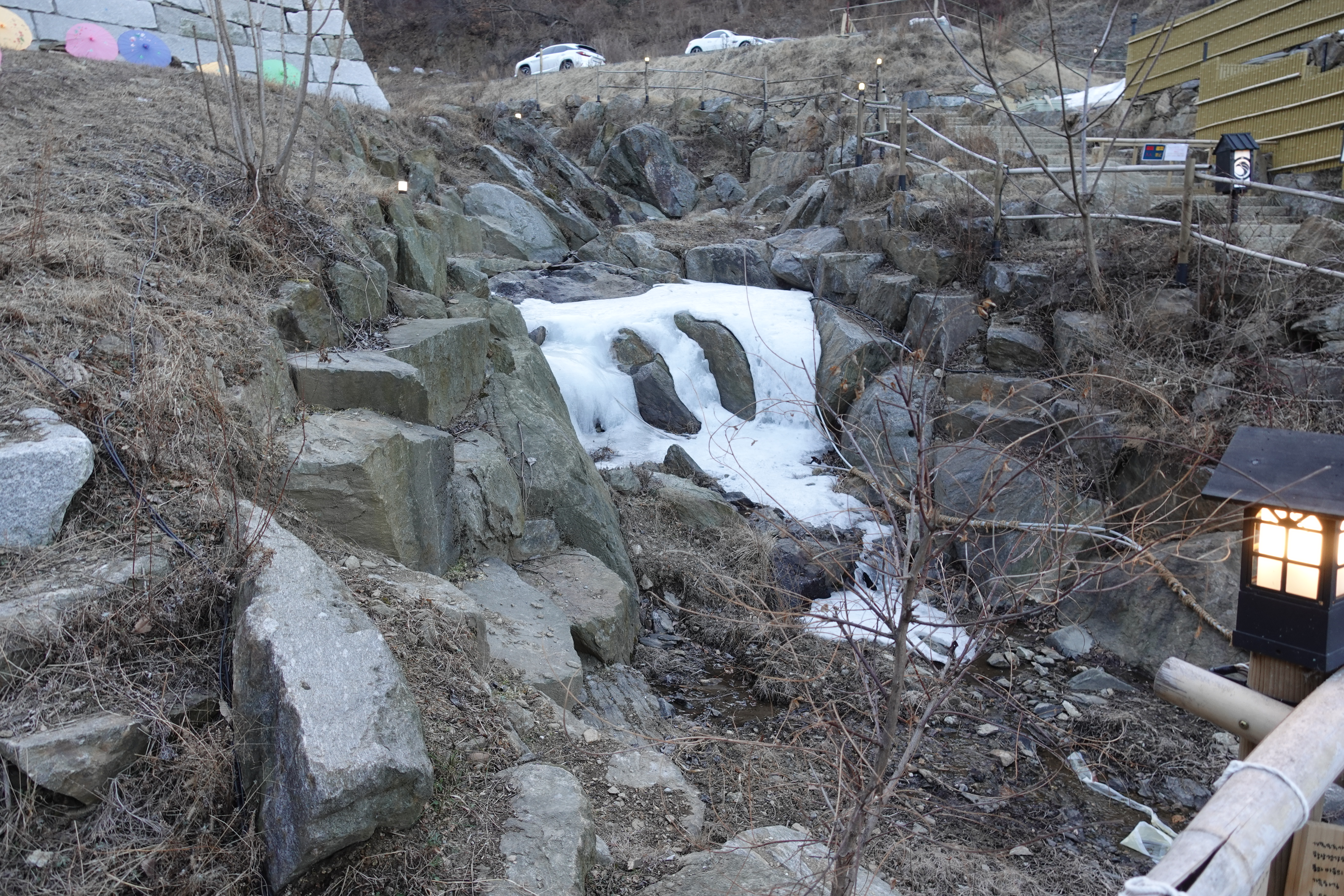밤이 되어 어두워지고 나면 길에 놓여진 전등에 불이 들어오고 훨씬 더 예쁜 풍경이 나타납니다. 한번 더 높은 곳에 올라가서 촬영해봤습니다.